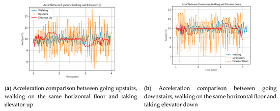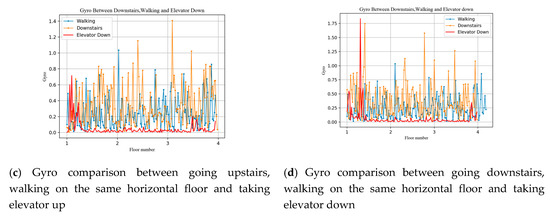Theoretically, acceleration can characterize a sudden change of user motion, such as an overweight or underweight state during floor switching behavior. The gyroscope can detect the turning motion between the floors when the user goes upstairs or downstairs. In order to verify the feasibility of this idea, we collected the measurements of accelerometer and gyroscope during walking, going upstairs, going downstairs, taking elevator up, and taking elevator down. The experimental results are shown in the Figure 5. Note that non-floor switching motion measurements are collected on the same floor and we stretch the data for comparison. As can be seen from Figure 5a,b different motions produce different acceleration change modes, such as a sharp drop and increase while taking the elevator up or down. And the acceleration also demonstrates a large degree of oscillation while going upstairs or downstairs compared to walking on the same horizontal floor. As shown in Figure 5c,d the gyro data are slightly different under different motion modes, and we expect the classifier to judge the user’s motion pattern by distinguishing the change pattern of acceleration and gyro.