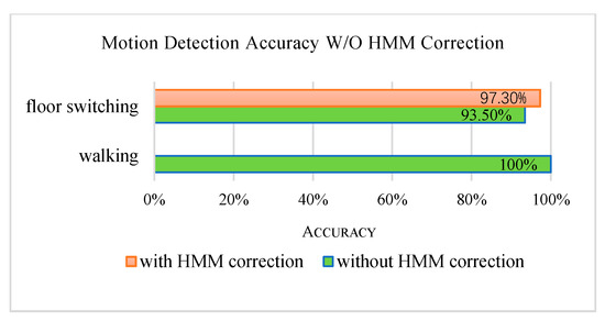 On the real-time testing stage, two testers walk on the horizontal floors and take floor switching activities for 5 min in Building 2, respectively. The motion detection accuracy is shown in Figure 6.