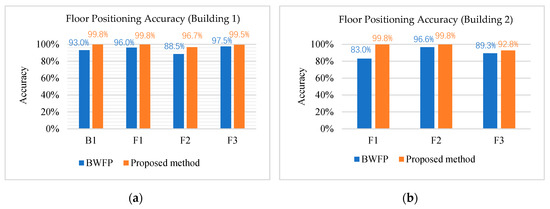 Floor positioning accuracy in (a) Building 1 and (b) Building 2.