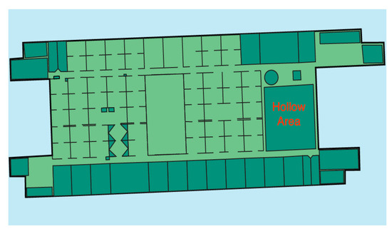 In more detail, we tested the relationship between the threshold value in the calibration process and the number of times BPFP is triggered, as well as the accuracy. Trigger tests were carried out on the seventh floor (F7) of Building 3. The floor plan of the F7 is shown in Figure 8. The hollow area is located at the right of the whole map, which is marked in red. It is worth noting that the HMM component was turned off during the trigger tests.