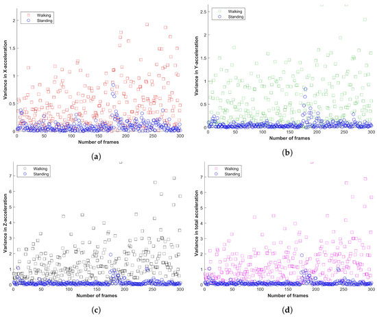 Variance in smartphone accelerometer data; (a) x-axis acceleration, (b) y-axis acceleration, (c) z-axis acceleration and (d) total acceleration.