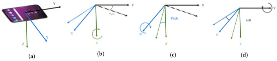 Rotation of smartphone in 3D orientation, (a) Smartphone coordinate system, (b) rotation around z-axis (yaw), (c) rotation around y-axis (pitch), and (d) rotation around x-axis (roll).