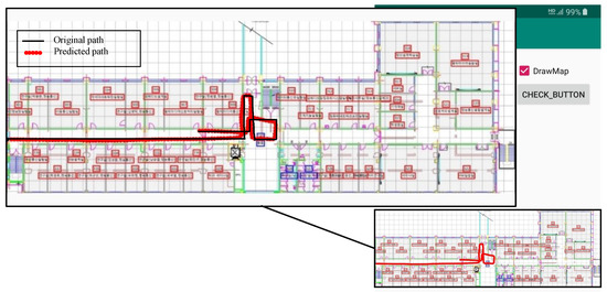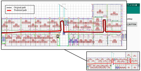 Direction estimation and distance estimation using the developed application for path geometry 1. The enlarged part of the screenshot shows the original and predicted paths.