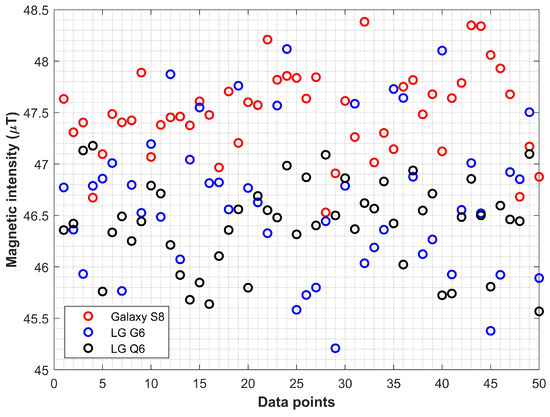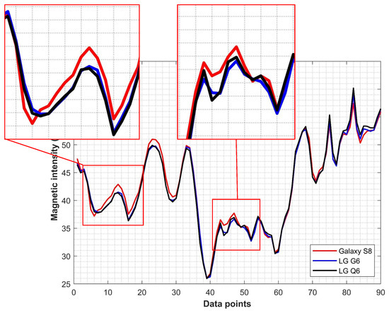 Recently the availability of a large range of micro-electromechanical system (MEMS) sensors embedded in smartphones provided new opportunities to perform the localization without the installation of additional infrastructure. These sensors though small in size offer sufficient precision to perform indoor localization. So, many approaches utilizing the data from smartphone sensors including accelerometer, gyroscope, and magnetometer have been proposed during the last few years [11,12,13]. Pedestrian Dean Reckoning (PDR) based localization provides a relative location and requires a starting or recent position of the user. Magnetometer, on the other hand, measures the earth’s natural magnetic field (referred to as ‘magnetic field’ in the rest of the paper) and works similar to Received Signal Strength (RSS) based Wi-Fi systems. It neither requires any additional infrastructure nor needs the starting position of the user. Although magnetic field-based localization systems offer a good level of accuracy, their performance is often degraded by the use of a large variety of smartphones that are available today. Smartphones’ companies install the magnetometers from various vendors, each with a different level of noise tolerance and sensitivity, which severely limits the full potential of such systems. Various improved techniques have been presented where the use of patterns formed by the magnetic field data (called Magnetic Pattern (MP) for simplicity) is preferred over the magnetic intensity to overcome the limitation of device dependency, yet, they are still limited by the procedure adopted to make the database [14,15]. It is argued that the MP from various smartphones is similar, however, this is not very well studied.