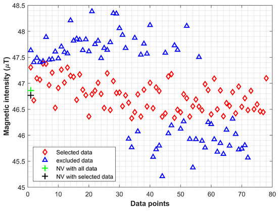 where is the error margin considered to select the data for the database. As stated previously, the data for the same smartphone varies so we need to define an error margin (threshold) to filter out the outliers. The value of is empirically set to 0.50 and based on the observed variation in the collected magnetic field data. The data whose value is higher than are regarded as outliers and discarded as shown in Figure 8.