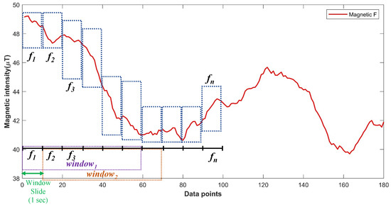 The magnetic field is the earth’s natural phenomenon generated by the flow of convection current in the earth’s outer layer. Being a vector (it has direction and magnitude), the magnetic field needs three parameters for its representation. A common approach is to use x, y, and z which indicate the north, east, and downward components of the magnetic field, respectively. An alternative approach is to show the magnetic field through the total intensity F, the inclination angle I, and the declination angle D [16]. From a magnetic positioning perspective, the magnetic field is often represented with x, y, z, and F. The magnetic intensity of the magnetic field differs from 25 micro Tesla to 65 micro Tesla [17] and its magnitude and direction remain approximately the same over a small restricted area. Despite that, man-made buildings interfere with the natural magnetic field and cause disturbances called ‘anomalies’, which have been utilized as fingerprints in many approaches [18,19].