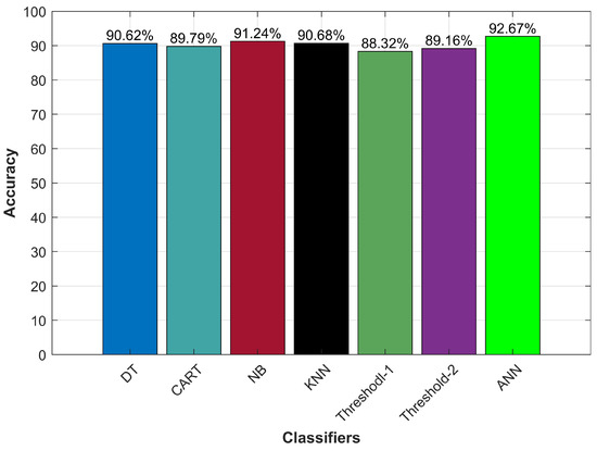 Motion detection involves the use of various algorithms to predict the user’s current states of stationary and walking which serves as an important module in indoor localization systems. It is important to detect if the user is walking or not. If the user is not walking then user new location estimation is not required which can save both energy and resources. Four machine learning classifiers and two methods that work on a threshold for acceleration are evaluated for their performance. Figure 11 shows the results for all the techniques.