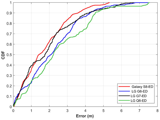 The CDF (cumulative Distributive Function) graph for localization using Galaxy S8, LG G6, LG G7 and LG Q6 using the proposed approach.