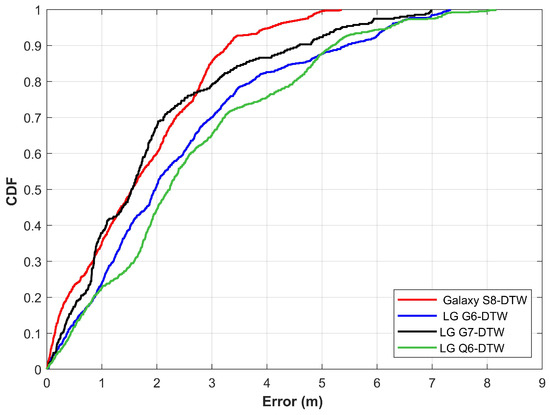 It is important to take into account the collective performance of the four smartphones used for experiments. The purpose of developing the database is to include the data from multiple devices to make the MP more effective when used with various smartphones for localization. The hypothesis was that it would increase the performance of the smartphones than that of using the database from a single smartphone. Results shown in Figure 13 prove the same. Results show that the localization performance with various smartphones, though marginally different, is almost identical. Another equally important point is the performance of LG G7. Even though the data from LG G7 were not incorporated in the database, the localization results of LG G7 are substantially similar to other devices.