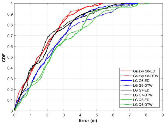 Results shown in Figure 14 demonstrate the localization performance with DTW. Localization performance is approximately similar for all the smartphones when the DTW is used. Figure 15 gives the comparison of results for ED and DTW. The performance is slightly increased by using the DTW for matching the magnetic field patterns. It is due to the capability of DTW to match the data of different lengths which is not possible with ED.