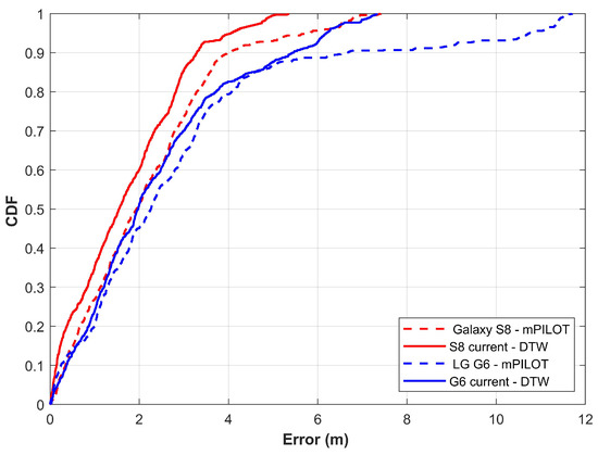 The approach in this study is an extension of our previously published work [14], hence we compare the performance of both approaches and discuss the improvements. Table 6 shows the results from mPILOT and the current approach. There is no doubt that the current approach outperforms mPILOT. The mean, as well as, the maximum error has been reduced. Galaxy S8 mean error has been reduced to 1.54 m from 2.17 and LG G6 to 2.39 m from 2.96 m. There is a substantial improvement in the maximum error for both smartphones as well and it has reduced to 7.41 m from 11.69 m.