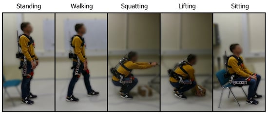Subjects performed a sequence of tasks while wearing the exoskeleton, representative of a typical working environment, shown in Figure 2. The task sequence was predetermined and consisted of random-number repetitions of the following movements: walking, sitting, squatting and lifting a 3 kg box from the floor. In between every movement, the subjects came back to a normal upright stance and awaited instructions on the next movement. The sequence of tasks was unknown to the subjects and the instructions were given out verbally, only after every completed movement. Each subject performed in total 20 walks, 20 squats, 20 box lifts and 20 chair sits. The subjects were not instructed to perform any specific lifting technique such as stoop or squat lifting. They were free to use their preferred lifting technique as well as perform all movements at their preferred speed. Data from the sensors was recorded using the Raspberry Pi at a frequency of 100 Hz. For reference, the average duration of the performed movements was 1.38 s ± 0.73 s, 4.64 s ± 0.86 s, 2.67 s ± 0.47 s, 2.98 s ± 0.39 s and 5.61 s ± 1.57 s for the tasks of standing, walking, squatting, lifting and sitting, which corresponds to an average of 138, 464, 267, 298 and 561 data samples. The total length of the experiment was on average 460.5 ± 52.3 s. Prior to the start of each recording session, we recorded the orientation of the IMU for 1 s. The mean value of this recording was used as a reference for normal upright standing (0 of trunk inclination). During the experiment, the exoskeleton clutch was disengaged at all times.