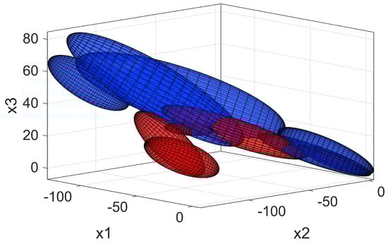 GMM representation in a reduced feature space for the lifting (blue) and sitting task (red); , . The axis , and represent right hip angle, left hip angle and trunk inclination, respectively. For reference, all movements start in the bottom right corner, continue towards the left side of the graph and come back to the starting position.