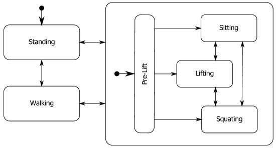 where is a fixed threshold value set to . Additionally, we add a hold condition that holds the current state of the state machine when the subject is in the middle of a sit, squat or lift. The rule for the hold condition is AND ( OR OR ), where and are fixed threshold values of and 5 respectively and denotes the rate of change of orientation of the subject’s trunk. The hold condition ends when the probability of standing or walking satisfies Equation (9).
