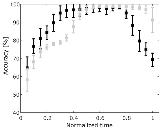 However, in our case, it is more important to look at results of support ON vs support OFF classification. For this binary case of support ON/OFF, the overall classification accuracy for all input data samples was % and the sensitivity and specificity were % and % respectively. The results of the performance metrics of accuracy over normalized trajectories are presented in Figure 5. We can observe that there is a very high accuracy for both cases (GMM and GMM+S) in the middle of the movement (at 0.5 of the normalized time). The GMM only (black error bars) shows a higher accuracy of recognition at an earlier stage of the movement (accuracy > 90% at normalized time 0.3).