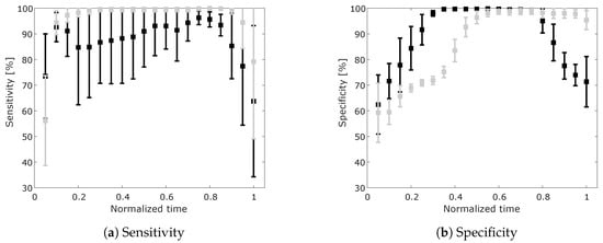 Sensitivity and specificity for ON/OFF classification are presented in Figure 6a,b. Here we can observe that using GMM only we obtain higher specificity of classification in the first half of the performed movements. This indicates a higher success rate of classifying support OFF when no support is required. However, the sensitivity of classification using GMM only is lower, with a higher standard deviation, compared to using the combinations of GMM with the state machine (GMM+S). This means that using the approach of GMM+S, we can reduce the number of misclassified movements when the support of the exoskeleton is required.