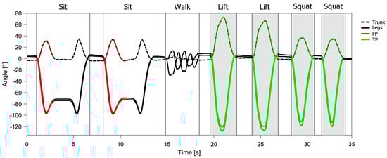 To evaluate the efficacy of our controller for support activation we performed a simulation of the actuation of the exoskeleton’s clutch. As stated in Section 2.1, the clutch of the exoskeleton needs some time to actuate. We have taken into account this actuation time, by reducing the angle at which successful engaging of the clutch is deemed possible. For an average motion of the user, this angle corresponds to 20. The exoskeleton should support the lifting and squatting movements, therefore the clutch needs to successfully engage at the beginning of these movements. In contrast to this, the clutch should be disengaged for the standing, walking and sitting tasks to allow free movement to the user. The results of this evaluation are presented based on the binary state of the exoskeleton’s clutch. A true positive result () is considered a successfully engaged clutch for lifting and squatting movements. A true negative result () is considered a disengaged clutch for standing, walking and sitting movements.