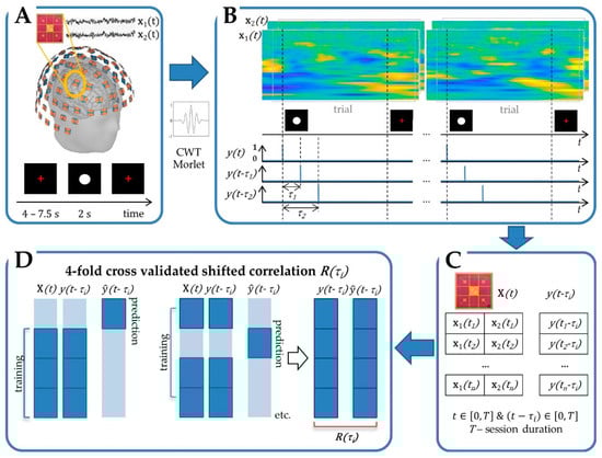 Cross-validated shifted multiple correlation is calculated in sensor space. (A) Neural signal recording with Elekta Neuromag system comprising 306 measurement channels organized in channel-triplets (two planar gradiometers and one radial magnetometer, not used in this study), on 102 silicon chips, in a helmet-shaped array. (B) Spectral decomposition using Morlet continuous wavelet transform (CWT) and feature extraction. (C) Matrices of features (e.g., for a channel-doublet of two gradiometers) and shift () for a given session, including trials and basic activity periods. (D) Four-fold cross-validated shifted multiple correlation.