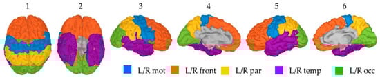 Anatomical location of the selected ten region for a given participant—1: frontal, 2: bottom, 3: right external, 4: left internal, 5: left external and 6: right internal view.
