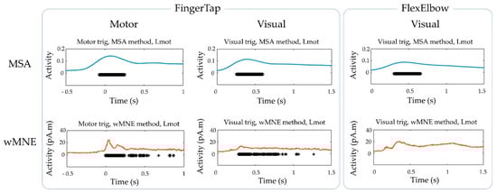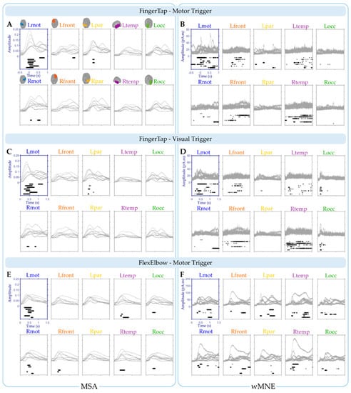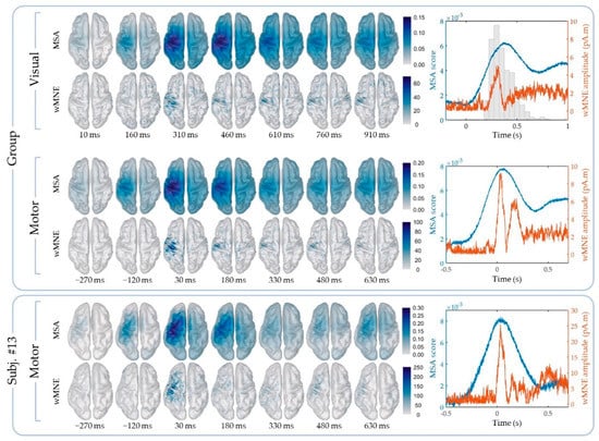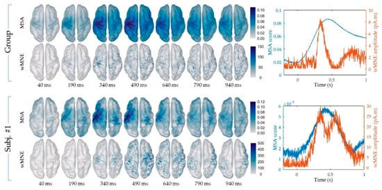 Again, the MSA method shows higher performance than the wMNE method to track selectively activations induced by specific movements. By replicating the results observed in the “FingerTap” experiment on the visual trigger, the MSA method provides a solid framework to identify critical brain activation features in the space–time domain.