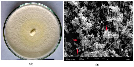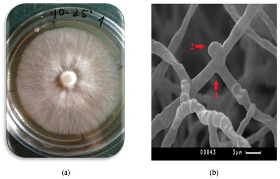 Colonies of P. eryngii (a) and an SEM image of P. eryngii mycelium (b): 1—branching hyphae; 2—clamp connection.