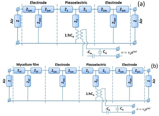 Mason’s equivalent circuits for the resonator with electrodes (a) without and (b) with the mycelium film under study.