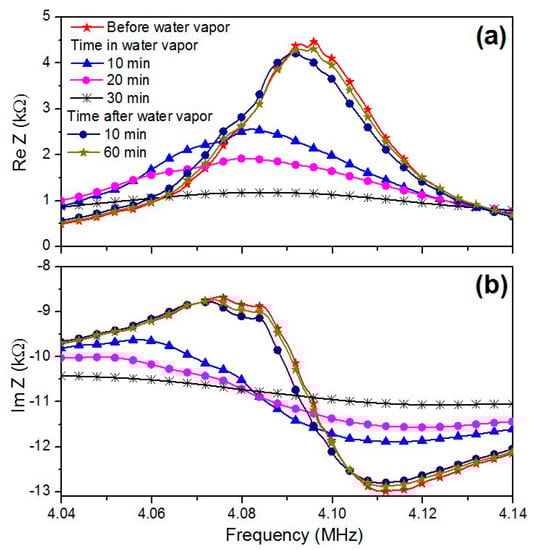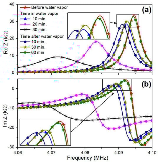 Figure 6 and Figure 7 show that, with an increase in humidity, the values of the real and imaginary parts of the electrical impedance and the resonant frequency decrease.