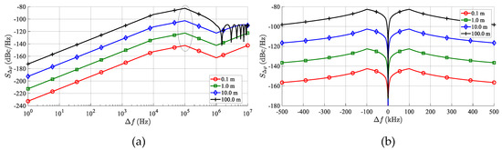 Phase noise spectral density (SΔφ (Δf )) of the TS up-converted output signal for an LO source with shown in Figure 7. (a) Plotted for the positive values of Δf in a log scale, frequency range 0–10 MHz. The marked frequency range is crucial when simulating more artificial targets at a single azimuth. (b) For both the positive and negative frequencies of Δf in a linear frequency scale, at a frequency range of ±500 kHz.
