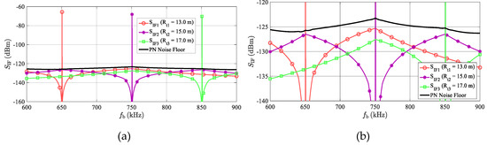 Figure 8 indicates that any integral of Equation (28) of the SΔφ (Δf) plot in a common B = 12.5 kHz-wide FFT window, including the beat frequency (fb) at Δf = 0, leads to very low values of NPN, resulting in negligible effects of TS phase noise on the AR sensor’s overall noise behavior. This situation can significantly differ if a simulation of multiple targets is required.