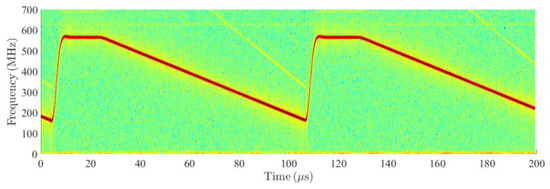 Measured spectrogram of received and down-converted signal from the MRR1 radar sensor with the external LO frequency set to 75.9 GHz. Transmitted chirps range from 76 to 76.5 GHz, while the active time of the chirp sweep is approximately 80 μs long.