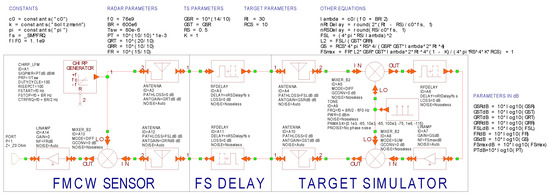 The simulation schematic set for proper RF noise simulation, containing the AR sensor with parameters stated in Table 1, is shown in Figure 11. The generated FMCW radar chirp is noiseless and the first stage adding RF noise kT0B is the TS receiving antenna. Both mixers in TS are considered as noiseless and the overall TS noise figure (FS) is assigned to the A7 amplifier. This amplifier, with variable gain (GS), also ensures the simulation of an artificial target with an appropriate RCS in accordance with Equation (3). The influence of free-space losses between the AR sensor and TS are included in the AR sensor’s and TS’s receiving antennas. The time delay between the transmitted and the received signal, resulting in an appropriate beat frequency in the radar receiver, is ensured by RFDELAY blocks including free-space (FS) delays on the distance (RS) as well. The total noise contribution of the radar to the received signals is introduced by the A14 amplifier with a noise figure (FR) and 0 dB gain.