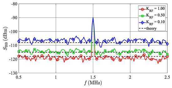 Simulated and calculated spectra of BB radar signals with additive RF noise. The beat signal at frequency 1.5 MHz is caused by an artificial target set to a 30-m range and an RCS equal to 10 m2. The amplitude of the beat signal is constant independently of the TS’s noise figure. Values of KRF = 1, 0.5 and 0.1 correspond to TS’s noise figures FS = 0, 85 and 95 dB, respectively. The “theory” lines represent the theoretical additive noise floors evaluated according to Equation (14).