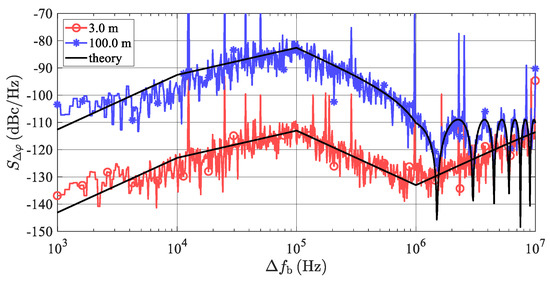 Simulation of phase noise at the radar BB output for targets at ranges of 3 and 100 m producing beat frequencies (fb) equal to 150 kHz and 5 MHz, respectively. The frequency axis of Δfb represents only the positive offset from the corresponding beat frequency. The spikes repeating every 1/Tsw = 12.5 kHz are caused by periodic discontinuities in beat signals at the start of every frequency chirp. The theoretical dependency of phase noise was computed using Equation (27).