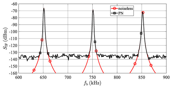 To verify the developed analytical description presented in Section 5, a simulation of an LO phase noise influence when generating more targets at a single azimuth was also performed. The resulting spectrum of signals corresponding to the AR sensor input can be seen in Figure 14. The simulation corresponds to three artificial targets with an RCS σ = 100 m2 at distances 13, 15, and 17 m. The concerned targets produce beat signals with frequencies (fb) equal to 650, 750 and 850 kHz and powers (PRt) equal to −65.6, −68.1 and −70.3 dBm. The phase noise parameters of the LO signal are shown in Figure 7. To produce a spectrum with higher resolution, the simulation was performed with a noise bandwidth equal to B = 1.25 kHz. To reduce side lobes, the Hann window was applied to the time domain signals before the FFT processing. In addition, to smooth the noise floor, 10 individual spectrum realizations were averaged. During the first simulation (marked as “noiseless”), all noise sources were turned off, whereas during the next simulation (“PN”), only the phase noise of an LO was introduced. The spectrum in Figure 14 should correspond to that in Figure 9, with the only difference being that the noise floor is about 10 dB less because of the ten-times narrower noise bandwidth used, as mentioned, to obtain a higher resolution. Considering this 10 dB shift, the agreement between Figure 9 and Figure 14 is very good.