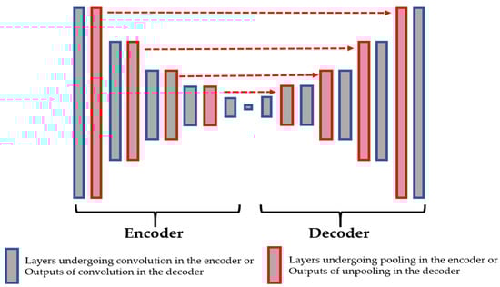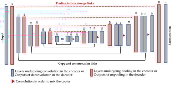 Another technique in order to assure a better preservation of the local structure is the use of the copy and concatenation operations, as proposed by Ronneberger et al. [43] with the so-called Unet, for the segmentation of the cellular images. This idea consists of mixing, by concatenation operations, the features from the encoder and their corresponding features in the decoder. All of the connections are made before the down-sampling process. Figure 4 illustrates the copy and concatenate process and provides the details of the finally proposed network. We propose using the pooling indices storage and the copy-and-concatenation techniques at the same time (see Figure 4 for the final structure). The unpooling is done in the same way as described above.