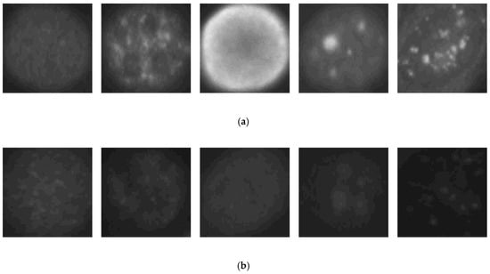 Example images from the SNPHEp-2 dataset. (a) The positive fluorescence illumination images. (b) The negative fluorescence illumination images. In (a) and (b), from the left to the right: homogeneous, coarse speckled, fine speckled, nucleolar and centromere cells.