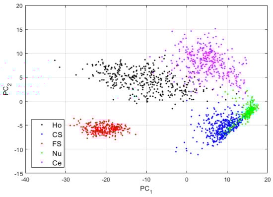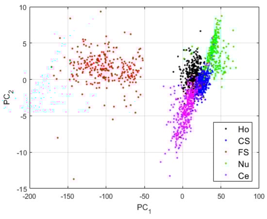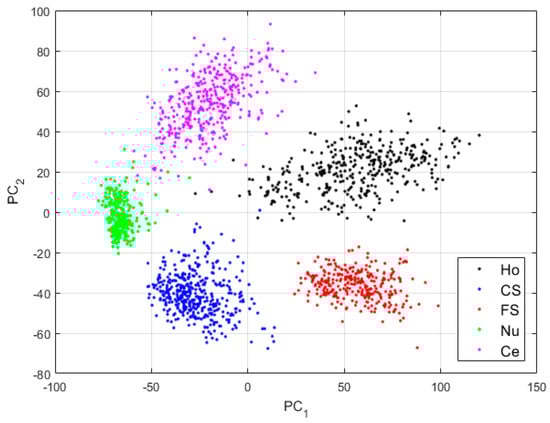 Visualization of the features learned by the DCAE in case-1. “Ho”, “CS”, “FS”, “Nu”, and “Ce” represent the homogeneous, the coarse speckled, the fine speckled, the nucleolar and the centromere cells, respectively. The percentages of the variance explained are, respectively, 99.23% and 0.42% for the first and second principal components.