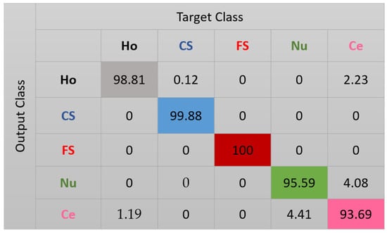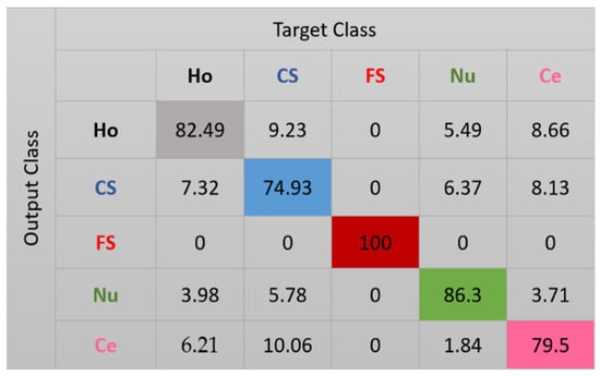 The features for this case are shown in Figure 10. We can note how, compared with the projections in Figure 8, the clusters continue to be more precise. Some of the nucleolar cells continue to be mixed with the centromere cells but, globally, the confusions between the cells are significantly diminished. The cluster’s assignment results are shown in detail in the confusion matrix depicted in Figure 11. As we can observe, most of the misclassifications have disappeared. The centromere cells are still mixed with some homogeneous (2.23%) and nucleolar (4.08%) cells. The most outstanding improvement comes from the nucleolar cells. The totality of the confusion between the nucleolar and the coarse speckled cells has vanished, with only some misclassification remaining between the nucleolar and centromere cells. The total accuracy of the clustering assignment is 97.59% for the results shown in Figure 11.