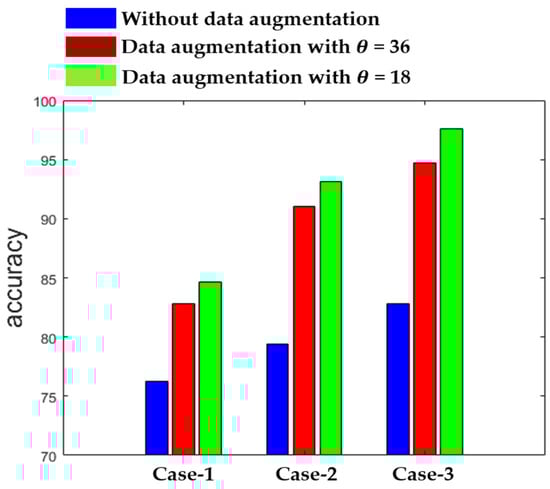 Figure 12 shows the summary of the results obtained by the three different networks in terms of the accuracy. The results in Figure 12 also demonstrate the effectiveness of using data augmentation when the training dataset is relatively small. As we can observe, the results remain poor with the three networks when we use the original data without any augmentation during the training. On the other hand, we can see how the accuracy is improved when data augmentation is applied. We show the results for = 36, which means that the rotation is undertaken with a step of 36°, increasing the number of training images by a factor of 10, and for = 18, which increases the training images by a factor of 20. Each of the three networks provides the best results with = 18, as shown in Figure 12.