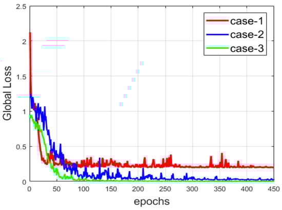 Another comparison between the three networks is provided in Figure 13, where we show the evolution of the global loss, which encapsulates the reconstruction and the clustering losses. Among the three cases, the network from case-3 provides the most minimal loss, since the copy-and-concatenation process alleviates the reconstruction process by allowing the network to preserve, at the best way possible, the local structure of the data. We can observe that the loss is smoother than that of the two other cases. The local structure preservation permits a faster reconstruction compared to the others. Note that the loss is also consequently diminished in case-2. With the results shown in both Figure 12 and Figure 13, we can note the improvement that occurs when the reconstruction is made in the best way possible (case-2 and case-3).