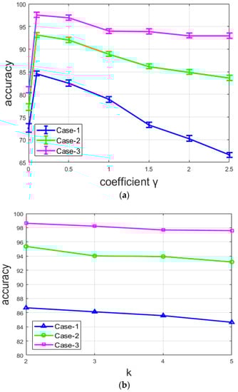 Accuracy of the three networks: (a) with different values of coefficient , and (b) with different values of k (number of clusters).