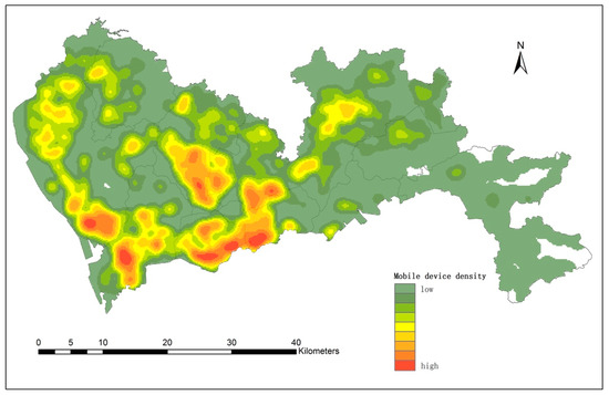 After data cleansing, the original data encoded by GeoHash string were converted to a raster data format with geographical latitude–longitude coordinates, and clipped with the administrative boundary of Shenzhen municipality in ArcGIS software. Figure 1 shows the distribution of active mobile devices at night in Shenzhen.