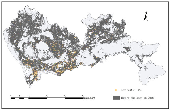 The auxiliary data include the fundamental geographical data, land cover data, and population statistics from the statistical yearbook. The land cover data of the urban impervious area in 2018 were adopted, which were obtained from Tsinghua University. Furthermore, in order to analyze the differences among various types of residential areas, the point of interest (POI) data of residential areas were acquired from the Gaode Map, one of the most popular map providers in the Chinese market. Nine hundred POIs covering different types of residential areas in Shenzhen were selected through the Gaode application programming interface (API). The attributes of POI data include the name of the place, category, address, geographic location information, code, etc. After preliminary processing such as the elimination of type misclassification and redundant points within an analysis unit (i.e., the size of a pixel), 871 samples were adopted. The spatial distribution of the residential samples is shown in Figure 2.