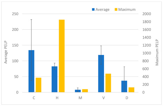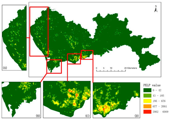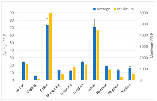 Gridded PELP values for the entire study area were calculated according to Equation (3). Regional differences in the 10 administrative districts are depicted. Both average and maximum values are compared among the districts. The analysis of variance (ANOVA) test was adopted to determine if there was a statistically significant difference between the averages.
