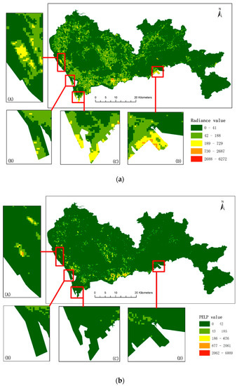 To conduct a street-scale analysis of light pollution, the PELP value for each grid cell was calculated. Considering that even very low NTL radiance would lead a higher PELP, if there is a huge population, a safety threshold for non-dangerous levels of brightness was adopted. The maximum NTL radiance of rural areas with vegetation based on the urban impervious area data were utilized as the threshold. Pixels with radiance below the threshold were not considered to be affected by light pollution. Figure 3 illustrates the spatial distribution of PELP in Shenzhen City. The PELP values were divided by 1000 in the following figures for a better display effect.