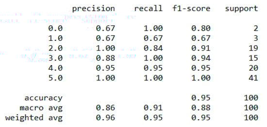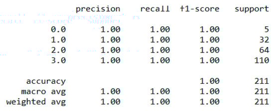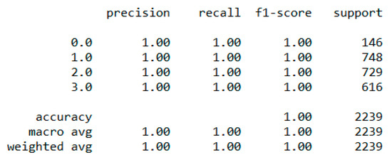 The “Eating-health-module” dataset has 11,212 records and many features, but we included the following important features after the correlation study—“erbmi”, “eusoda”, “eusnap”, “euincome2”, “eugenhth”, “erincome”, “eudietsoda”, “euffyday”, “eufdsit”, “eufastfdfrq”, “ertseat”, “eudrink2, “eueat”, “euexfreq”, “euexercise”, “eufastfd”, “eumeat”, “eumilk”, “eustores”, “eustreason”, “euwic”. During the data pre-processing, we included records with a value > 1 and excluded features such as “erincome” due to high correlation [37]. It resulted in 11,192 records and 21 columns. Then, we added an extra feature, “body_composition”, based on the “erbmi” feature, and the feature classified the records among four classes—underweight (0), normal weight (1), overweight (2), and obese (3). We processed the data with ML classification algorithms to classify the records based on the “body_composition” feature, and the “Decision Tree” classifier performed the best with a 99.7% accuracy, as depicted in Figure 13. The finest parameters of the “Decision Tree” classifier were {best criterion: entropy, best max_depth: 36, best number of components: 13, min_samples_leaf=1, min_samples_split=2, and splitter=’best’} following the grid search method. The regression analysis of the selected feature revealed that sweet beverages, economic condition, fast food, sleeping, meat and milk consumption, a drinking habit, and exercise have a sharp impact on growing obesity in humans.