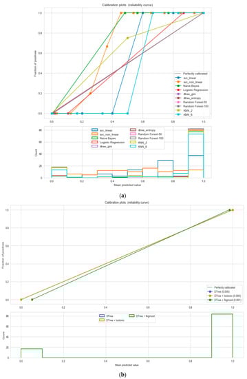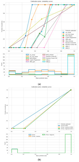 (a) Reliability curve to classify the “Eating-health-module” data with different ML classifiers. (b) Reliability curve to classify the “Eating-health-module” data with the “Calibrated Decision Tree”.