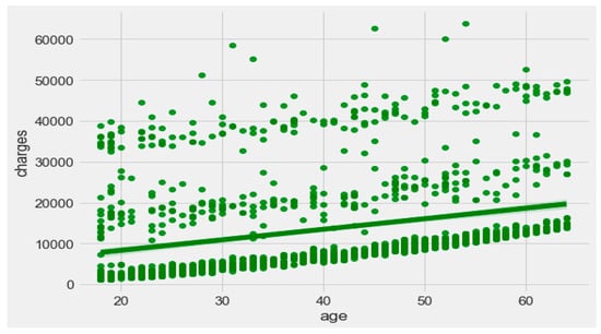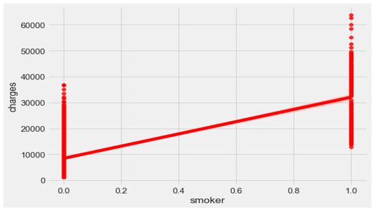 The finest parameters of the “Decision Tree” classifier are {best criterion: entropy, best max_depth: 24, best number of components: 6, min_samples_leaf=1, min_samples_split=2, and splitter=’best’}, following the grid search method. For the regression, we used “charges” as a predicted feature and performed the hypothesis testing with “ANOVA” results to retain Ha= {a significant change between the three age categories (young adults, senior adults, elders) with “BMI”}, with a P-value of 0.001, 0.060, and 0.000, respectively. The boxplot analysis in Figure 9 exhibits that “BMI” increases with “age”, and average “BMI”s for each of the groups are in the obesity range, which is a risk. Therefore, the body composition changes with increasing age both in males and females, and this is a risk to humans. The pattern of the data demonstrates that the charge of the insurance increases with increasing age, as depicted in Figure 10. From Figure 9, it is evident that BMI increases with age. Hence, with a transitive relation, it is evident that the charge of the insurance increases with increasing BMI. The change in insurance charge with smoking condition and age is depicted in Figure 11.