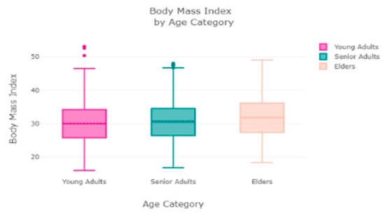 Jindal et al. [23] performed ensemble machine learning approaches for obesity prediction based on the key determinants—age, height, weight, and “BMI”. The ensemble model utilized Random Forest (RF), generalized linear model, and partial least square, with a prediction accuracy of 89.68%. Grabner at al. performed a study on “National Health and Nutrition Examination Survey (NHANES)”, “National Health Interview Survey (NHIS)”, and “Behavioral Risk Factor Surveillance System (BRFSS)” datasets from the 1970s to 2008 to analyze the trend of BMI in the USA over time and across race, gender, socioeconomic background, and status (SES). It was observed that SES–BMI gradients were steadily more significant for women than for men.