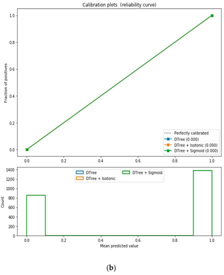 For calibration-based classification, we converted the multiclass “Eating-health-module” dataset to a binary classification problem following the logic that if (underweight, normal weight) then “body_composition” = 0, else 1. The uncalibrated “SVM”, “Decision Tree”, and “Random Forest” classifiers performed the best in the binary classification. On the contrary, the calibrated “DecisionTree” classifier outperformed the other classifiers, as depicted in Figure 14, following the “isotonic” and “sigmoid” calibration methods with a Brier score = 0.000. It illustrates that both the calibrated and uncalibrated “Decision Tree” classifiers give same performance.